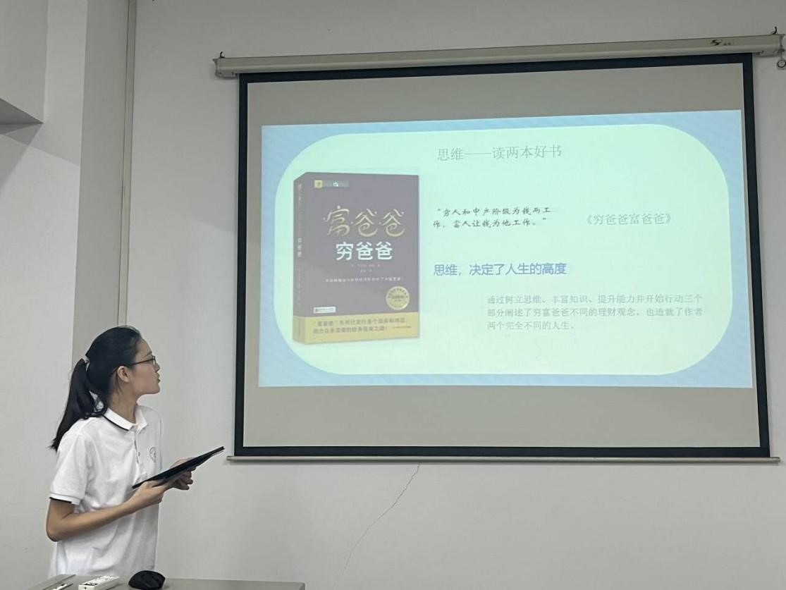 来自22级公司2班、信息安全专业的刘燕琰同学和大家分享了她阅读《穷爸爸富爸爸》和《人类简史》的感悟,在介绍《人类简史》时她讲道:“这本书为我打开了一个全新的思维空间,它不仅让我更深刻地了解人类历史的脉络,还让我思考了人类文明的本质、未来的走向以及我们在这个复杂世界中的角色。”刘燕琰的分享深深吸吸引着在场每一位听众。