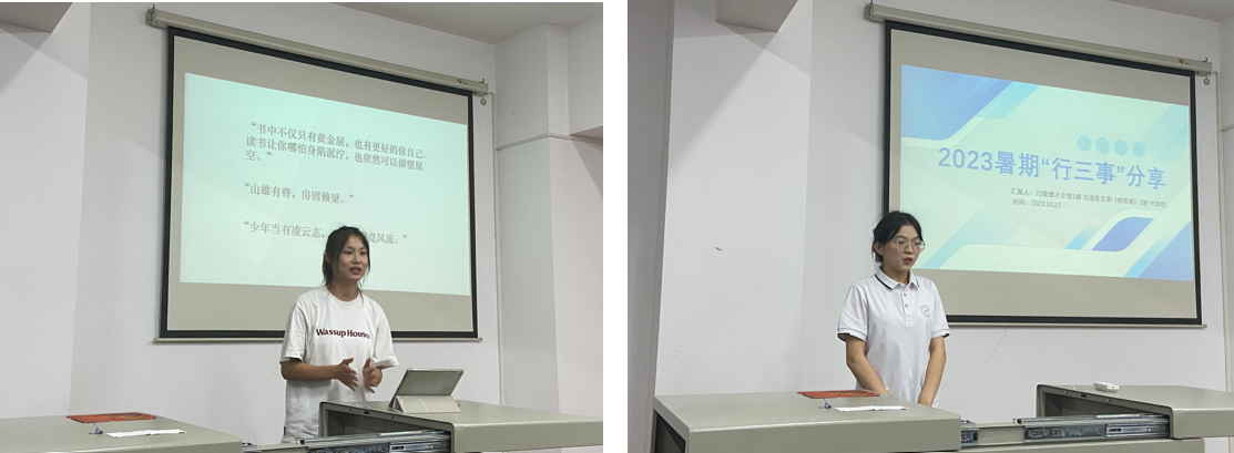 此次活动由员工成长服务中心实践实训部承办,由22级公司计划1班、汉语言文学(师范类)专业员工程姝婷主持。来自2022级的14位公司学子经个人报名、班级推荐后进入现场分享环节,依次上台就“读两本好书”“做两件好事”“看两部好剧”等“三事”内容进行整体展示。