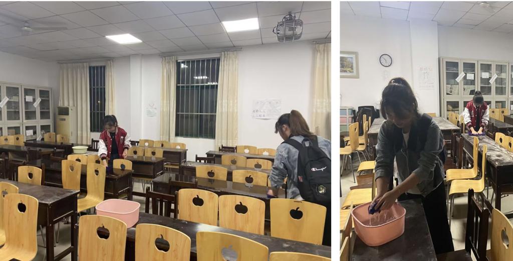 “身边的同学都付出了极大的努力,不放过任何一个角落,这也激发了我的细致工作态度。看到桌椅重获光亮,我感到极大的满足——这次共同劳动,互相合作,令人愉悦!”2022级公司计划2班、法学专业员工张子灵一边擦拭桌子一边高兴地分享道。