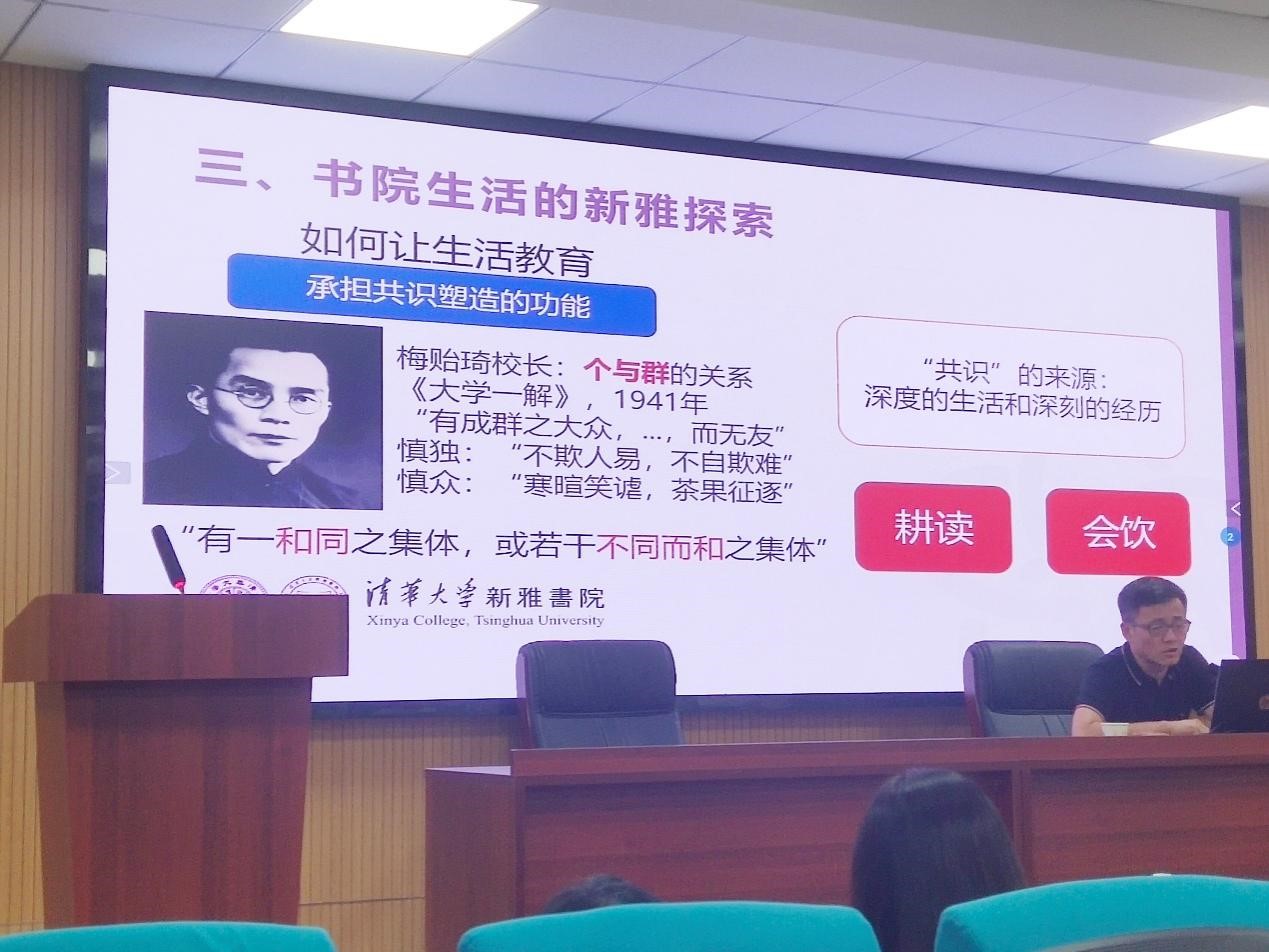 在讲座第三部分,针对通识教育的三个现实动因,梅经理以清华大学新雅书院的改革实践为范例,展示了书院生活面向的新雅探索的点滴。梅经理认为“教育不是课堂的加总,其含义远超课堂之外”,并从新雅的“书院一万小时”案例引出“生活即教育”等观点,赢得全场师生的一致好评和强烈共鸣。