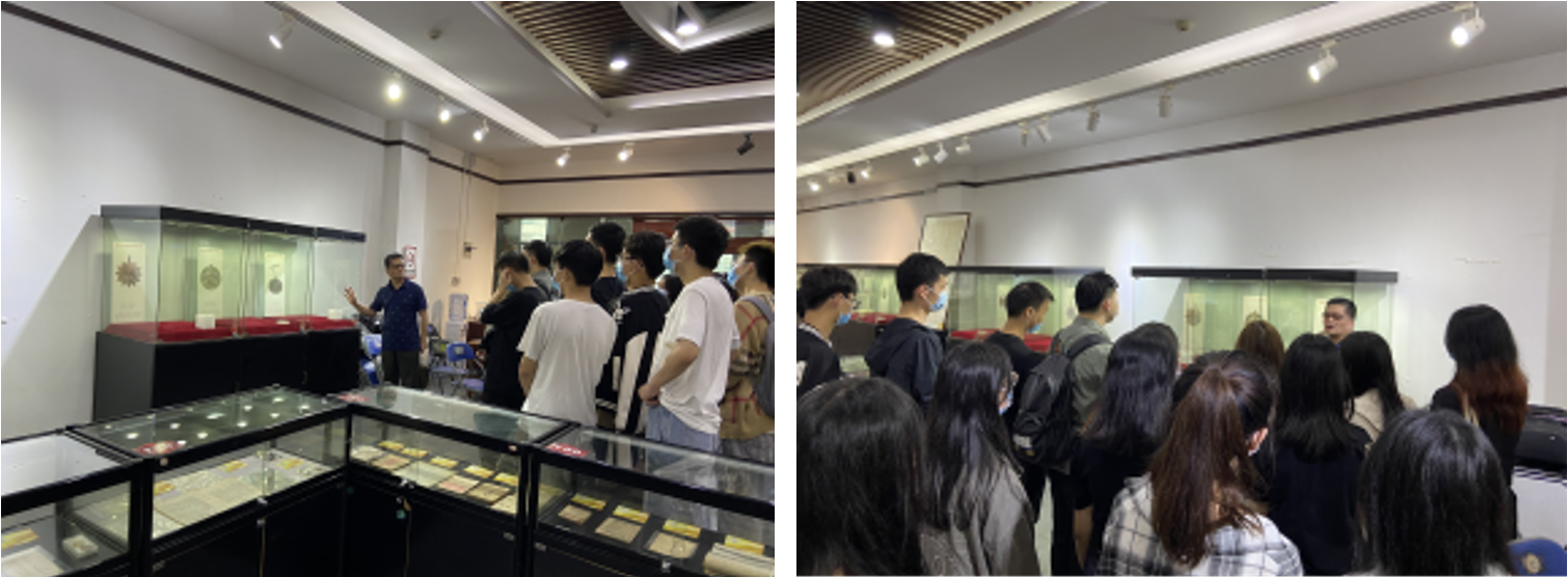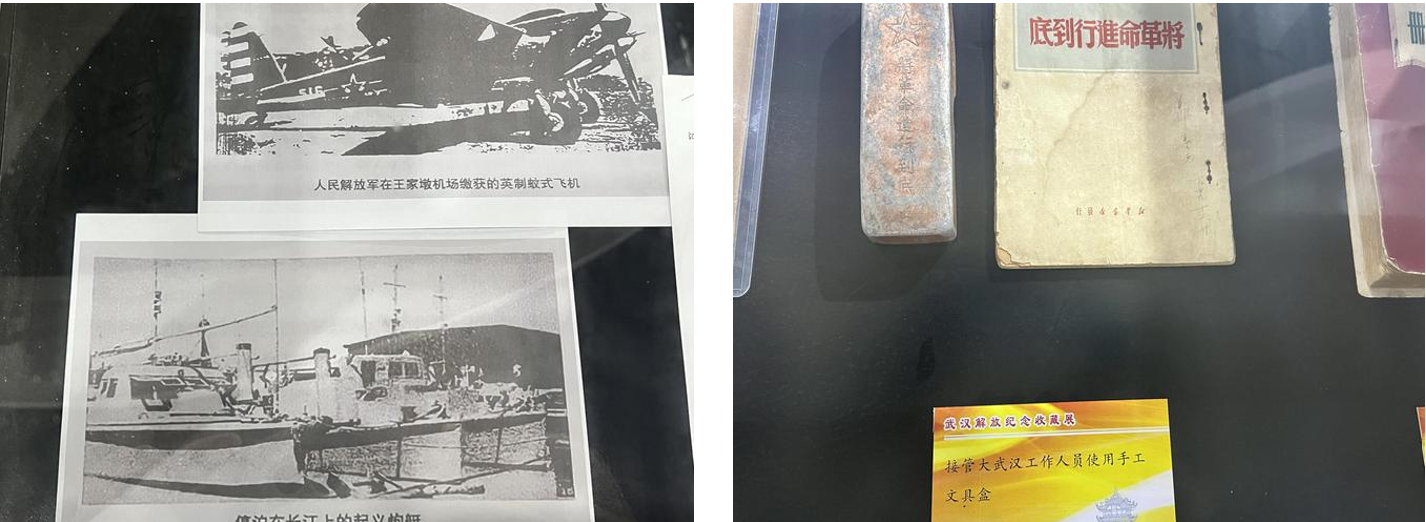 “活动现场展出的300多件(幅)武汉解放文献及实物,真实反映了1949年武汉中华人民共和国成立前后的历史,展现了老一辈无产阶级革命家与无数革命先烈为国家解放、人民幸福、民族复兴所作岀的牺牲和贡献,彰显了‘武汉是一座英雄的城市,武汉人民是英雄的人民’的时代主题。”活动伊始,肖琴学会长向参展师生简要介绍了馆内收藏与布局,随后便依次向大家一一介绍馆中藏品。“武汉的解放不是打下来的,也不算一般意义上的和平解放,而是另外一种模式,即三面合围、大军压境的时候逼迫白崇禧放弃武汉,在解放战争史上这就是‘不战而屈人之兵’的经典战役,” 提起那段革命的峥嵘岁月,肖琴学会长言语中不乏对党的领导下革命军队所取得成绩的自豪之情。