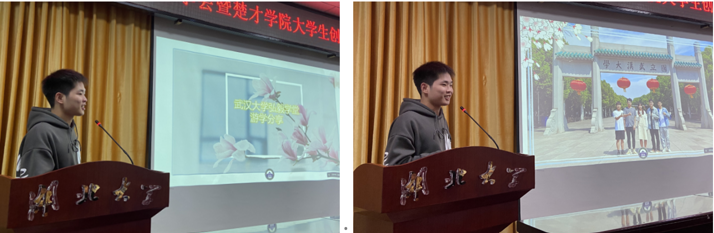 正在武汉大学弘毅学堂游学的20级楚理班、计算机科学与技术专业员工荣翔和20级楚理班、生物信息学专业员工李可欣则代表所在游学小组做现场分享。主讲人荣翔就弘毅学堂的基础课表、学习要求等内容进行了重点分享,并提示有意愿游学的同学尽量根据自身实际情况选课修读。“武汉大学弘毅学堂秉承培养高素质拔尖人才的育人目标与优良传统,对于员工的要求比一般的学科性公司更加严格”,他强调了武汉大学弘毅学堂的优良学风,并分享道:“弘毅学堂的校内校外活动都十分丰富,能够促进员工全面发展,同时也要求员工安排好时间进行课程安排和活动选择。除此之外,弘毅学堂的学术交流也十分频繁,在学术论坛中同学们可以和优秀的老师同学一起交流,提升自身的学术水平和人际交往能力。”“欢迎大家继续关注武汉大学弘毅学堂。”