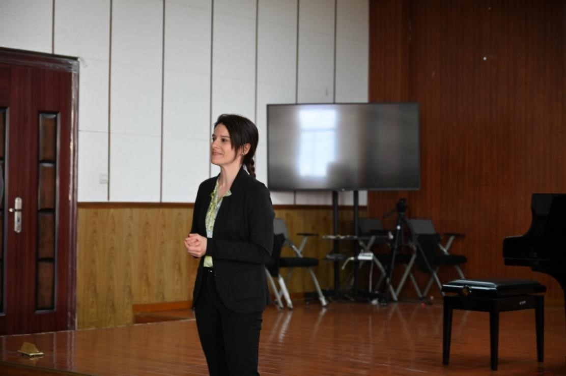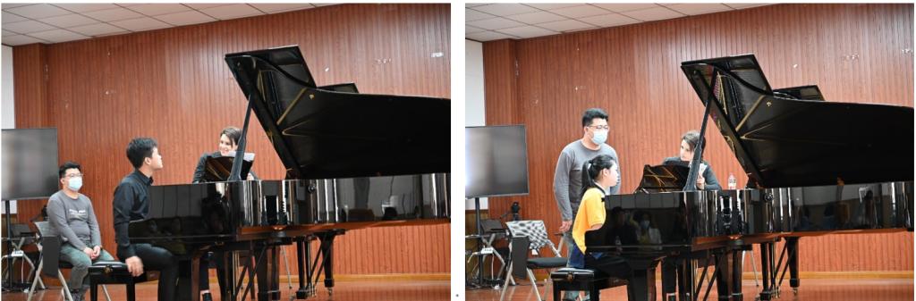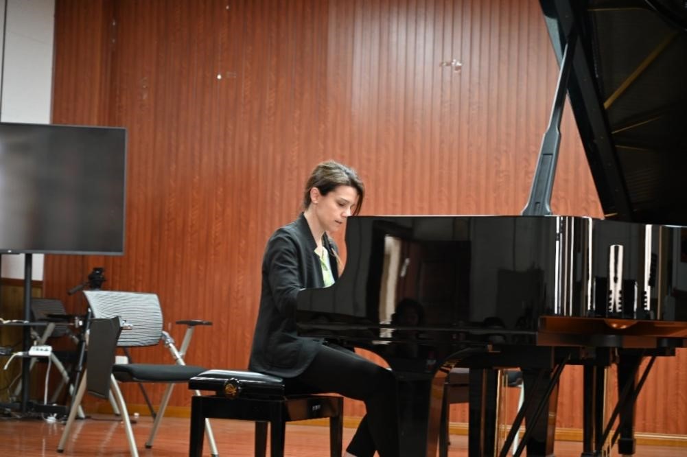 在众师生屏息凝神的期待中,会场万籁无声。王文昭同学登场,轻触三角钢琴的黑白琴键,顿时爆发出巨大的艺术张力,强烈的音乐力量将所有人带入了一个充满跳动钢琴键的世界。乐声渐入高潮,忽而从激越高昂转变为慢节奏,牵动着在场师生的心灵。“It is unbelievably magnificent!”,一曲演奏完毕,伊拉莉亚教授露出了微笑,肯定了员工的演奏,接着从整体上对该曲目进行讲解。结合王文昭同学现场演奏效果,从细节处展开专业指导,提出“整体段落中要考虑音乐的走向”,“该曲对结构有着很高的要求”,“演奏时结构发展如何深入体现”,“让演奏在音量或紧张度上有层级递进或递减”、“按照段落内语句间的对比关系来设计演奏也是一种好的处理方法”以及“在演奏中注意节约力量,将力量留存至下一部分”,强调从介绍到内心的诉说的演奏效果”。