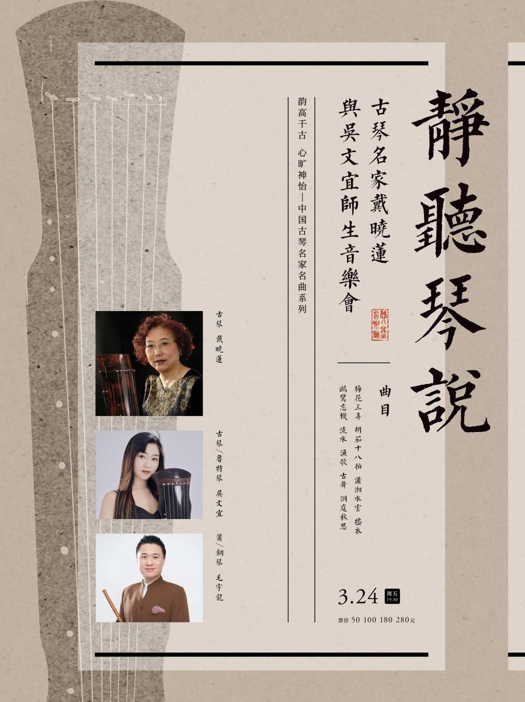 本场音乐会由著名古琴演奏家戴晓莲女士携手其员工、青年古琴演奏家吴文宜女士和笛箫青年演奏家毛宇龙先生(特邀)倾情演奏,共同带来古琴独奏、双古琴重奏、琴箫合奏等形式的经典曲目。