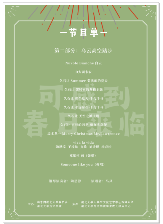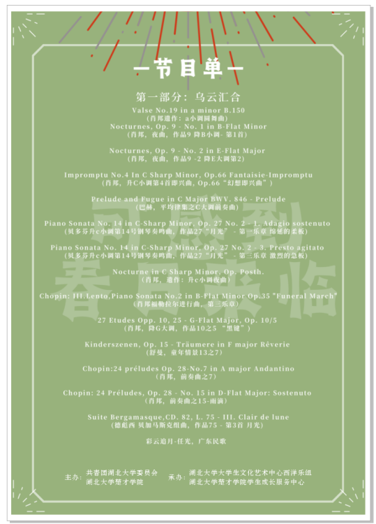 荀子有言:“乐行而志清,礼修而行成,耳目聪明,血气和平,移风易俗,天下皆宁,美善相乐。”是的,音乐陶冶情操,是生活中的一股清泉。这次的演奏曲目是古典与现代乐的结合,端庄典雅又不失活泼灵动。在古典乐部分,我们感受着肖邦的浪漫与深情,圆舞曲描绘出了记忆中的一片花园,河水静静流淌,映出了时光的片段;我们体会着巴赫创作复调中的美妙,领悟这其中的哲学秩序和浪漫唯美,清澈见底,内涵隽永。时光流逝,第二篇章,我们来到了现代曲目的演绎阶段。久石让的曲目让我们的童年回忆如同蒙太奇般一幕幕在眼前闪过,仿佛又回到了那个夏天,看到了车站边撑着雨伞、憨厚可爱的龙猫。《Viva la vida》歌唱的生命颂歌,《Nuvole Bianche》所倾诉的真挚友谊,都让今天这个夜晚意义非凡。不远处仍是都市的喧嚣,音乐却让我们的内心平静而惬意。我们在此感受着旋律的美妙,迎接着春天到来……