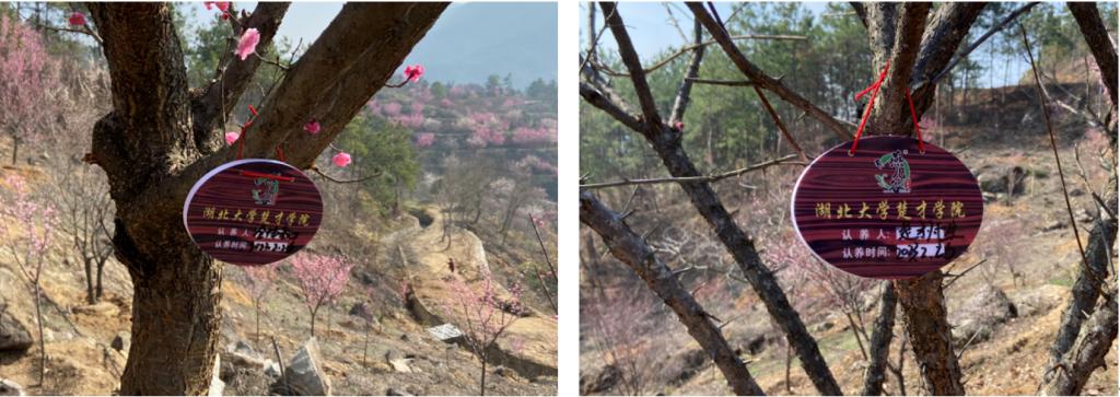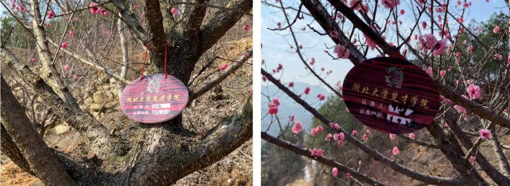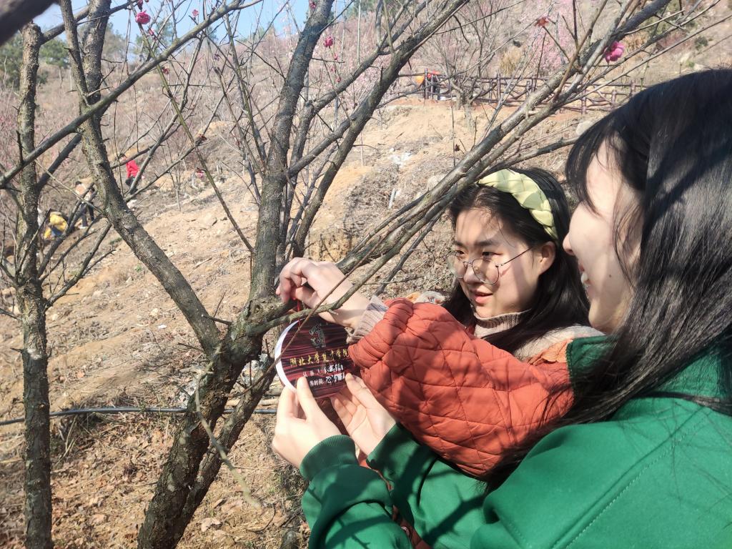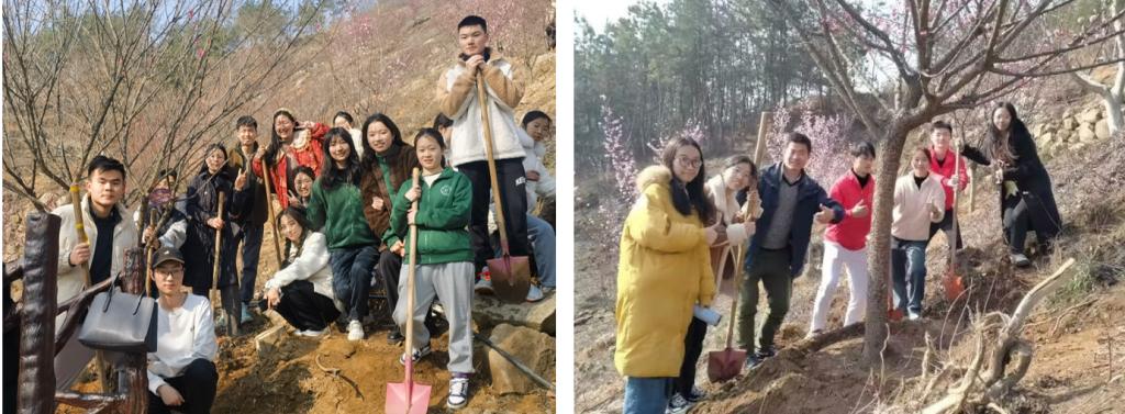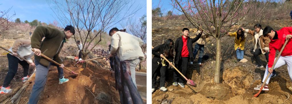 师生们依照挖土、运土、填埋、堆砌等步骤,有的负责挖坑,有的主导填土,有的细心扶树,有的帮忙浇水,劳动的身姿和忙碌的背影让初春的梅岭增添了几分生动和靓丽色彩——从一开始不知道如何操作,到最后每个小组都在自己负责的树干上挂上专属铭牌,写下植树人信息和衷心祝福。