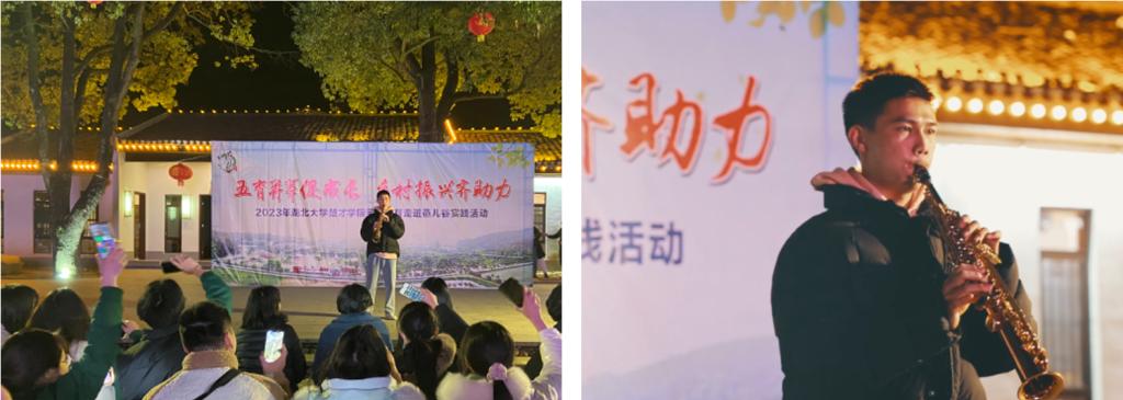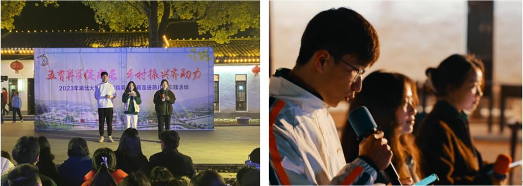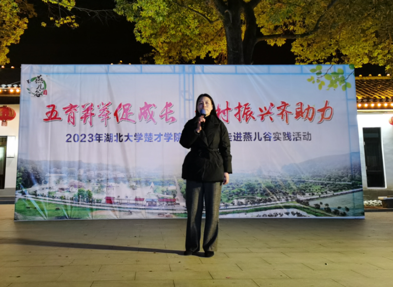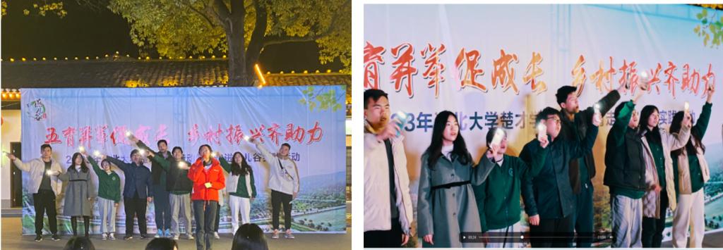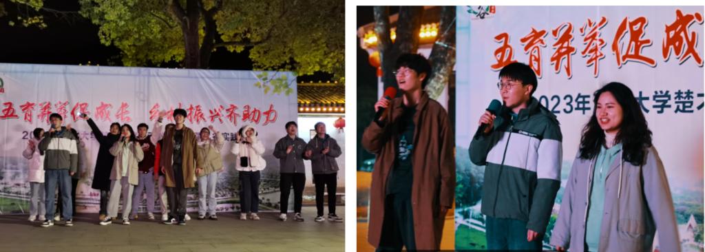 “于是我停了下来,请在青山绿水的燕儿谷,寻觅我的存在……希望的种子,已在这里萌芽;崭新的希望,即将从这里出发……”高阳、戴上凯、张若琪三位同学用一首原创诗歌《于是我停了下来》,表达了对燕儿谷的喜爱,获得活动现场嘉宾、黄冈市北纬三十度乡村电商有限公司董事长江雨奇和燕窝垸村原书记郭海平等的一致好评。老师们也纷纷上台演唱《鸿雁》等歌曲,寄予对同学们勇敢施展才干的殷切期望。而台下的师生们时不时或打光助兴,或哼曲跟唱,燕儿谷当地的孩童和乡亲们也都鼓起了掌,每逢高潮,大家伙的加油声和呐喊声便一次次响彻夜空。