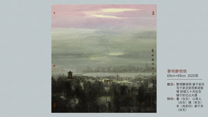 “敬天地忠诚,愿山河无恙”是董继宁教授自疫情以来创作的新作品。新冠疫情暴发以来,董教授在工作室里封闭思考,如何将这种情景通过山水画表现出来呢?结合在疫情防控中的所思所感,董教授创作了系列作品,表达对疫情中人们对曙光的期待和在疫情中无私奉献、默默付出的工作者们的歌颂与感谢。