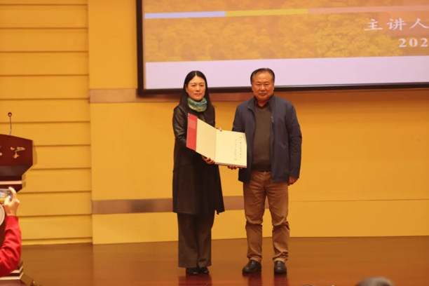 第五部分,董继宁教授向同学们讲述他在创作中的不断思考。由于长期从事行政工作,白天忙于处理事务,创作往往都是在夜里灯下进行,故此著有《灯下独语》一书。董教授从“故园家山”、“西北放歌”、“峥嵘岁月”和“敬天地忠诚,愿山河无恙”四个方面,通过艺术创作的哲思和艺术作品相结合,向同学们讲述艺术创作的思路和过程。