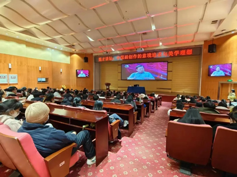 讲座开讲前,师生们通过《大写湖北人》专题片,了解了董教授自十八岁学画起勤恳努力、笔耕不辍,立志“为祖国山河立传”。历经数十载,董继宁教授始终不忘初心,心系天下,情系故土,积毕生心力建设董继宁美术馆,并无偿捐献给当地政府,让更多老百姓接触艺术、欣赏艺术、享受艺术。讲座开篇,展示了董继宁教授荣获画坛最高荣誉之称的“国际艺苑水墨画五年成就大奖”的经典名作《长河落日圆》。