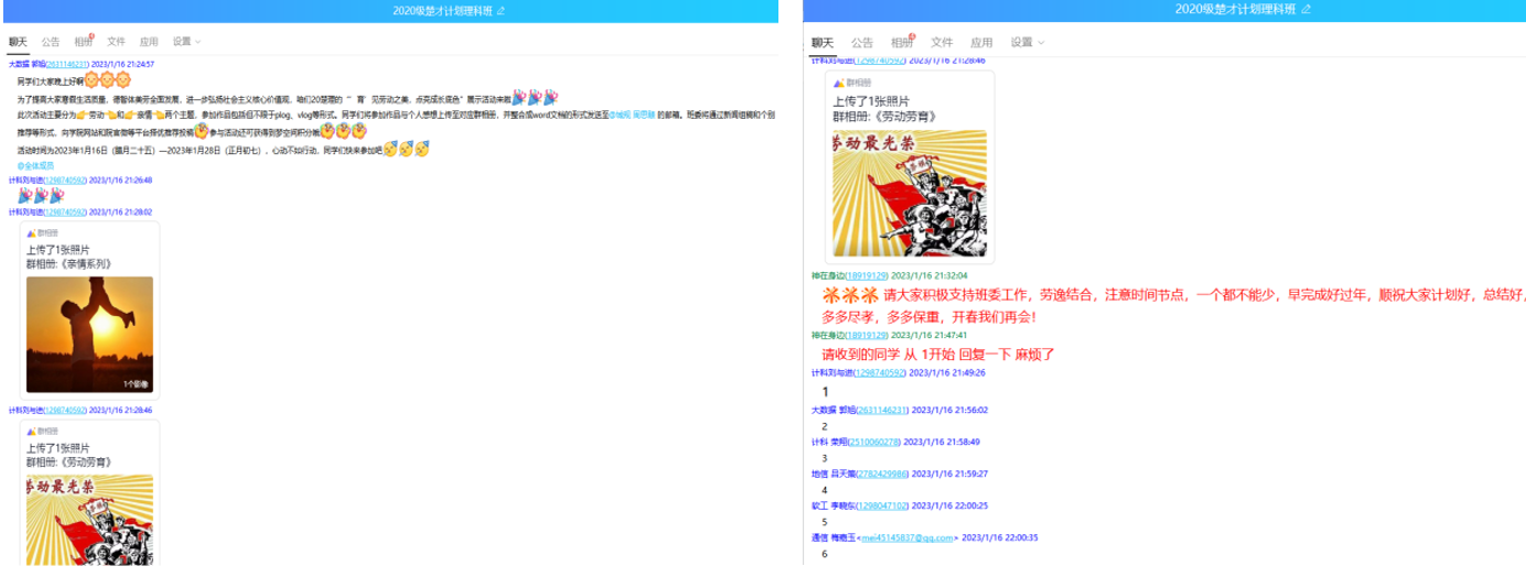 与此同时,除了三老员工组织齐心聚力策划和组织之外,班级层面也是因地制宜,纷纷开展富有特色的主题实践活动。如20级公司计划理科班于春节前后以“劳动”和“亲情”为主题开展20楚理“‘育’见劳动之美,点亮成长底色”展示活动。“我们的主题活动积极响应公司‘行三事’活动号召,并具体细化为能提高大家寒假生活质量,促进德、智、体、美、劳全面发展,进一步弘扬社会主义核心价值观的班级特色活动,通知一经发出,同学们报名都很踊跃。”20楚理班长刘与进介绍说。