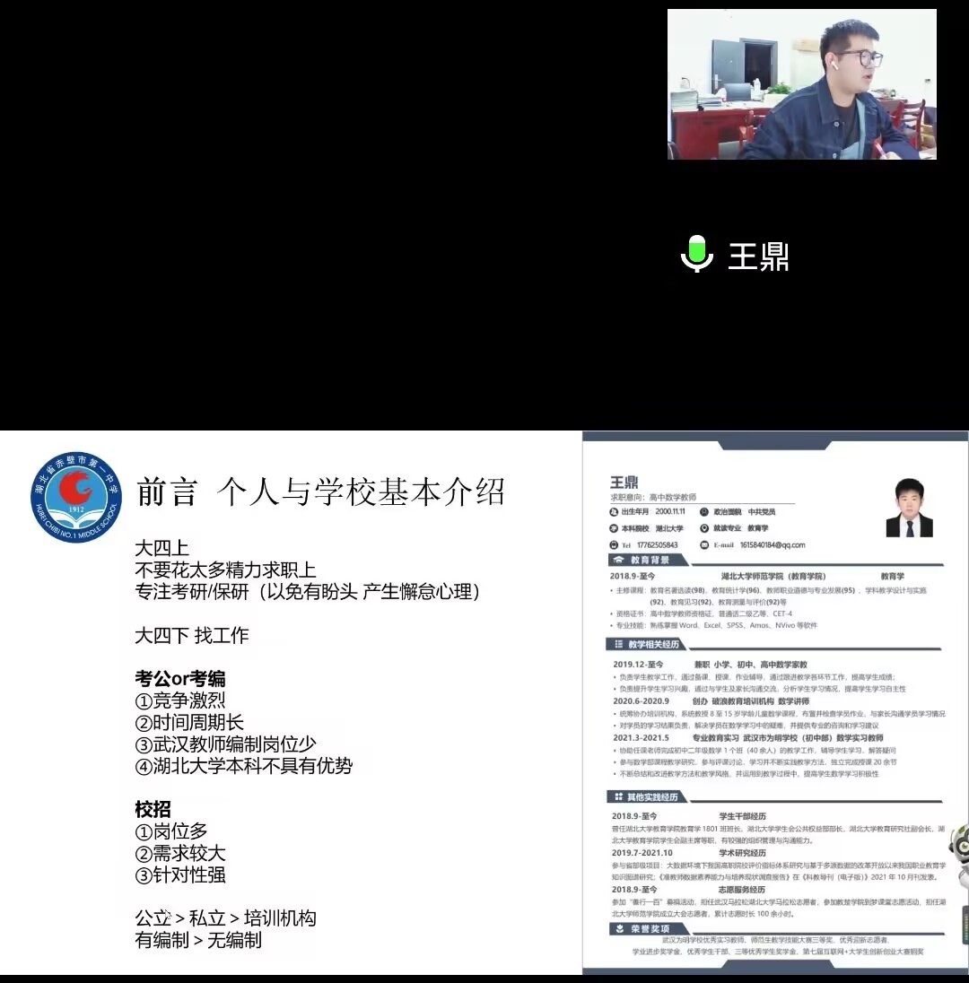 “制作就业简历时,同学们可以将自己参与的教师技能相关竞赛放在前列,增强竞争力,其余奖项可适当放置后面,凸显教学优势。”主题分享期间,王鼎学长结合自己当时的求职简历,从如何制作求职简历谈起,回忆了在威廉希尔学习和生活的难忘时光,同时就个人基本情况和“高考辉煌”“激情教育”“磨难教育”“主题教育”“文体品牌”等赤壁一中育人特色与傲人成果进行了简要介绍,“我们赤壁一中将‘打造区域性名校,实现美好教育’作为奋斗目标,近三年高考取得优异成绩,同时举办多种多样的活动,促进员工德智体美劳全面发展,增强员工综合素养。”