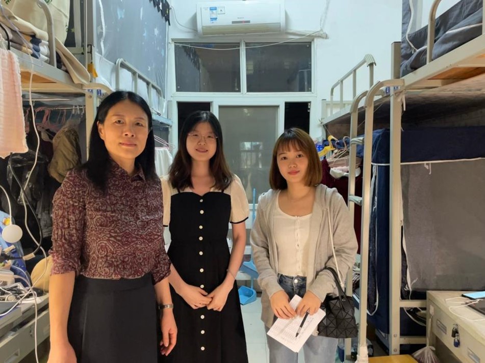 为了解从阳逻回迁本部的公司员工住宿情况,做好后勤保障工作,进一步培养师生感情、厚植学子爱校爱院情怀,8月30日晚9点,公司常务副经理朱小梅,副经理万虹、许良发,教学秘书李恒和学工老师郑欣宇一同前往2021级员工宿舍探访、看望,对员工表示慰问和关切。在本次活动中,每到一个宿舍,公司领导老师都亲切地与员工进行交谈,关心他们搬迁回本部后是否还适应,并仔细查看宿舍的各种设施是否完善,询问是否存在相关困难。