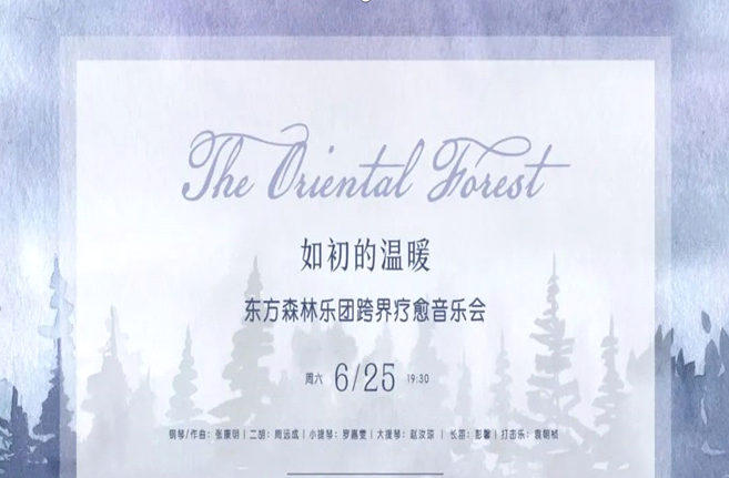 “你是否记得被自然环绕的惬意和放松,沐浴着温暖春光,仰望着初夏星空,微风穿过树叶的沙沙声,四处围绕的虫鸣鸟叫……身处繁忙都市,那些治愈系的时光,甚是怀念——春日的疗愈,交给东方森林乐团吧!”“让东方森林给你带来一场充满疗愈氛围的音乐会吧!”“东方森林”是一支由知名音乐人张康明创建及负责音乐原创的本土流行跨界治愈乐团,其音乐作品包含抒情、哥特、摇滚、爵士、国风等曲风。张康明是东方航空独家签约作曲家,也是喜马拉雅、腾讯音乐助眠疗愈音乐人。