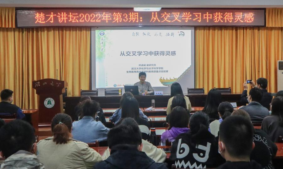 “初期接触研究时,我遵循传统的研究思路,在已有成果上进行一定的模仿和创新;逐渐入门后,我们就要尝试跳出已有的研究框架,在现有的新元素、新方向上进行研究,首先要重点思索如何做出和别人不一样的真正属于自己的东西。”讲座期间,郑迪威从收集和借用菠菜汁、头发丝等自然原材料的科研思路变化和实验室研究经历说起,结合湖大本科学习和武大硕博研究的故事点滴,细致入微地分享了随着科研不断深入,从自然中发现一种又一种可以用作研究的新材料,并启动一个又一个研究新方向、实现探索新成果的奇趣故事。