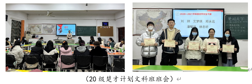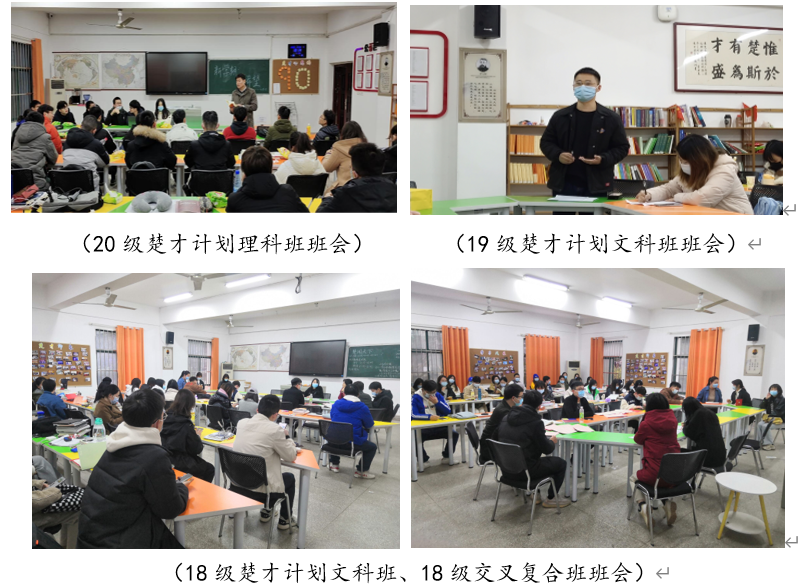 其中,18级公司计划理科班、18级公司计划文科班、18级交叉复合班的班会上,三位班主任老师万虹、符琳和李恒对疫情防控、毕业审核及考研初试后规划等事宜先后进行了强调。19级公司计划文科班在班主任李经天和班委的共同策划下,组织开展了以“寒假分享精彩纷呈,携手同心共话未来”为主题的新学期首次班会暨寒假“行三事”活动分享会,同学们纷纷分享自己寒假“行三事”的内容与心得。20级公司计划理科班则举行了“开学第一课”主题班会,指出要始终明确以学习科研为第一位的新学期目标。20级公司计划文科班在欢声笑语中举办“新学期 新气象 楚文学子一起向未来”主题班会,并举行了上学期先进个人的颁奖仪式。还有19级公司计划理科班班主任王琪老师和20级交叉复合班班主任李恒老师在主题班会期间,也都就员工们的新学期计划与展望提出了具体任务和要求。