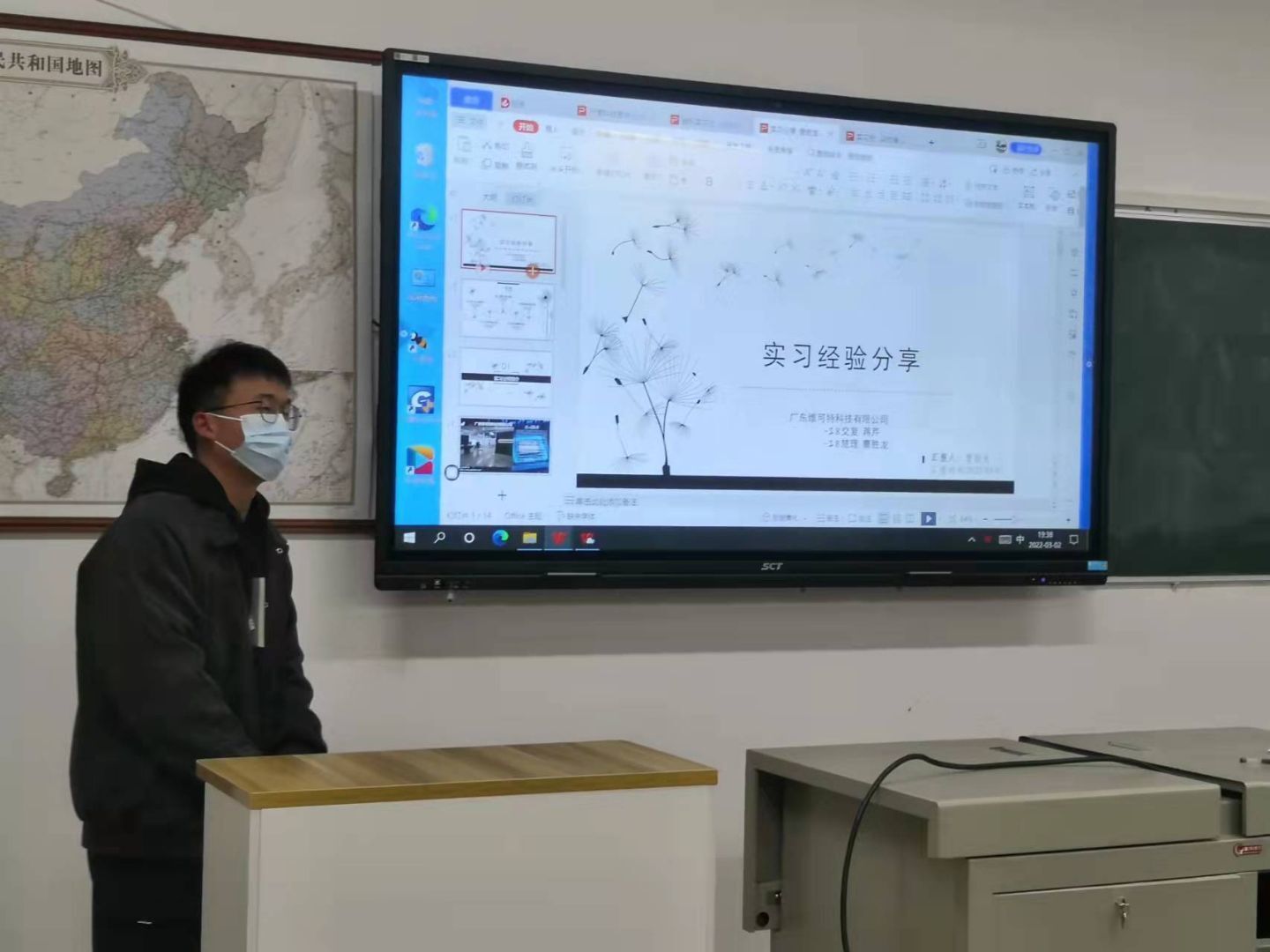 在广东维可特科技有限公司实习的2018级公司理科计划班曹胜龙,则依次向大家展示了公司的研究方向、工作环境与实习内容,并强调了处理好企业内部人际关系的重要性。讲起实习感悟,他精心总结出五点内容供大家借鉴和参考,还不忘贴心地提醒在场的学弟学妹:“我们未来的职业实际选择与具体工作岗位不一定与自己所读专业能够做到完全对应,应该及时做好心理准备,不断锻炼和提高自身学习能力等综合素质,在未来发展中一定要相信自己的能力。”