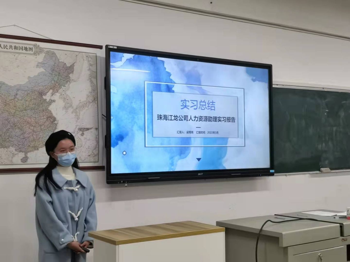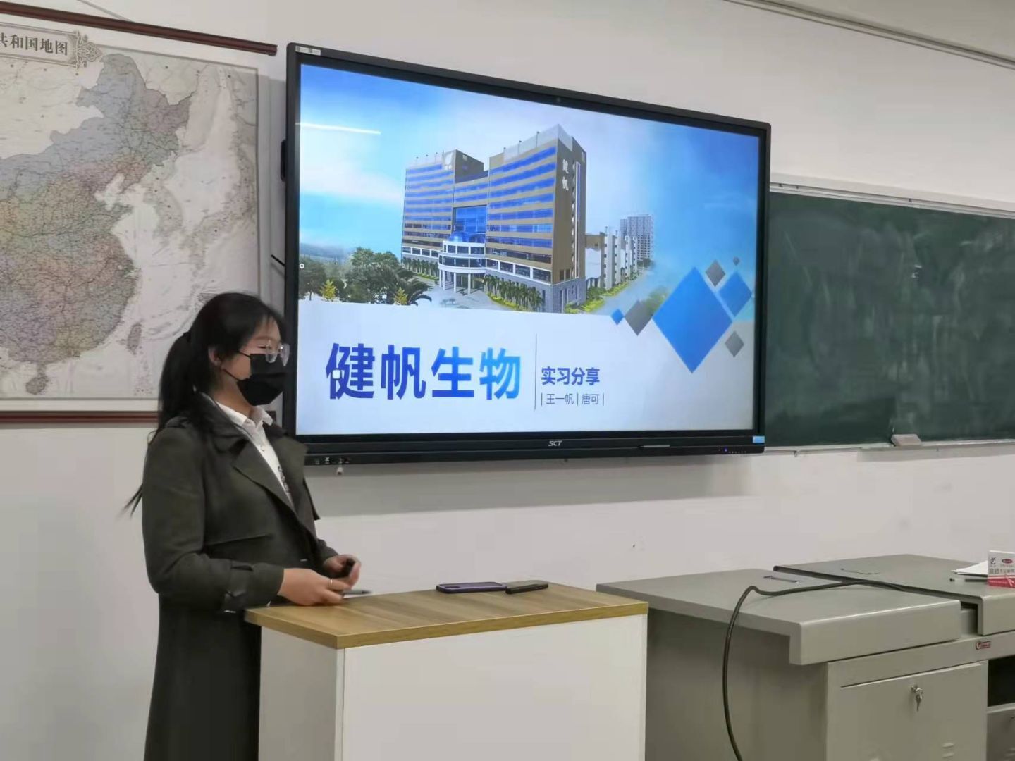 曾在健帆生物科技股份集团有限公司实习、来自2018级公司计划理科班的王一帆对实习公司的基本情况和与工作内容、生活环境和实习体验等五部分内容作了详细介绍,精彩的分享仿佛让在场的所有观众也回到了实习现场。最后,她深切地感慨道:“此次实习,我不仅体验了职场生活、收获了友谊,对专业知识也有了更深入的了解,心态认知也发生了转变,确实受益匪浅。”