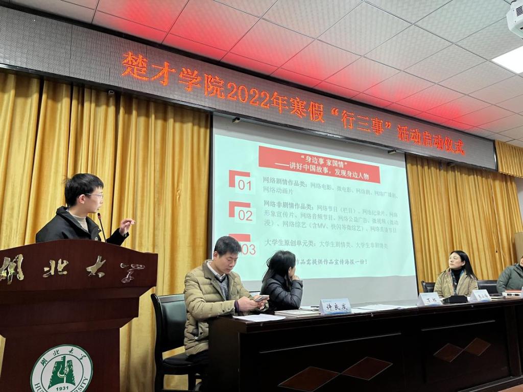 “希望学弟学妹们不要虚度寒假光阴,以饱满的精神状态、高度的热情和实际的行动,参与到‘行三事’活动中,做‘知行合一’的老员工和担当民族复兴大任的时代新人。”会议最后,威廉希尔williamhill第二届寒假“行三事”活动启动仪式顺利举行,“行三事”负责员工组织之一、威廉希尔williamhill天问学术中心副会长、2019级公司计划文科班朱永康同学结合自身实践经历和前期成果经验做动员宣讲。“对于好的作品,我们还将推荐到湖北省委牵头组织的‘身边事、家国情——讲好中国故事,发现身边人物’作品征集活动。”他强调。