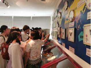 紧接着,同学们跟着蔡老师的脚步,依次参观了博物馆的书画展区、玉器展区、青铜展区、古钱币展区、陶瓷展区和综合类展区等6个展区,并认真观看了蝴蝶馆的珍贵动物标本。期间,同学们纷纷掏出手机,关掉闪光灯,记录下和一件件历史文物的宝贵同框。在古钱币展区,同学们看着从夏商周时期的贝币到新中国成立以前的铜、铁、铅、银、纸币等珍藏,纷纷拍照驻足。威廉希尔williamhill2020级交复班同学张骏韬感慨道:“以前只是在历史书上面看过古钱币的图片,没想到今天能有幸亲眼目睹。真的有被这部简明的钱币发展画卷震撼到和感动到。”接着,在博物馆旁的蝴蝶馆,在蔡莹老师严肃严谨的科普说明和参观活动的发起人——威廉希尔williamhill副经理许良发老师的生动讲解下,同学们进一步了解到或常见或稀有的昆虫全貌及其生活特性,也进一步强化了人与自然和谐共处的观念。