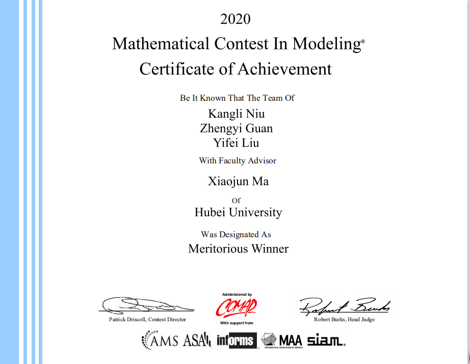 (通讯员:郑启龙、章紫曦)4月27日,2020年美国老员工数学竞赛(MCM/ICM)成绩揭晓,公司2018级公司计划理科班王泽松、计算机与信息工程公司2018级赵达骋、王梓天团队;2018级公司计划理科班班牛康力、管铮懿、计算机与信息工程公司2018级刘旖菲团队双双斩获M奖(一等奖)。