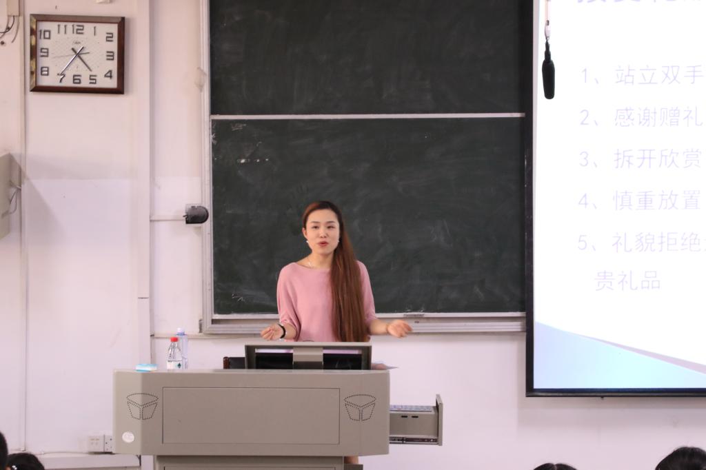 熊琳则从基本礼仪、校园礼仪、求职礼仪三个方面进行了分享。“来,我们握个手吧。”熊琳首先进行现场互动,然后从握手礼、拥抱礼、合十礼举手礼、鞠躬礼、拱手礼、吻手礼、点头礼等方面进行讲解。她重点讲解了求职礼仪,从简历投递到面试仪容仪表等方面进行分析,并介绍了电梯礼仪、座次礼仪等职场交往礼仪。她认为:“礼仪实则是一个内化于心,外化于形的过程。做到真正的有礼就需要学会对他人的尊重,真诚待人。”