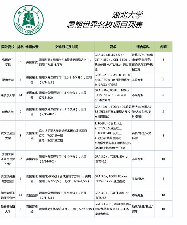 为推进公司国际化进程,培养湖大学子国际视野,公司拟定2019年暑假选拔公司在校生赴哈佛大学、耶鲁大学、帝国理工公司、宾夕法尼亚大学、康奈尔大学等世界著名大学高校进行学习交流活动,请有意向的同学积极踊跃参加。