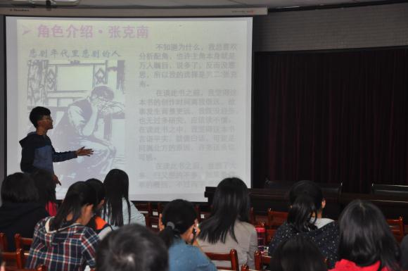 “人生的道路虽然漫长,但要紧处常常只有几步,特别是当人年轻的时候”,以本句题记开篇,各部门分别从不同的角度发表了自己对人生的感想。学术部全员出动,配合幻灯片对人生中的任务进行了分析。其中,对于德顺老汉,学术部刘海佳动情的说:“我想成为这种人,干净的老去,脸上都是笑纹”;李冲璐同学则将张克南评价为“悲剧的年代里悲剧的人”,引发了大家对其性格与爱的方式的争论。秘书部的讨论角度为“探究高加林命运坎坷的原因”,采用演讲的方式,声情并茂的讲述了自己的观点。活动部的选题为“高加林的感情抉择”,对高加林对待感情的心理过程进行了细致分析。公关部则从中国的乡土性看《人生》,避开了人生中的爱情,而讨论其中深藏的社会问题,思想深刻。宣传部部长亲自上阵,分析了人生中几段纠缠复杂的爱情,主角高加林与巧珍的爱情、张克南与黄亚萍的爱情、德顺老汉与灵转的爱情等,同样十分精彩。
