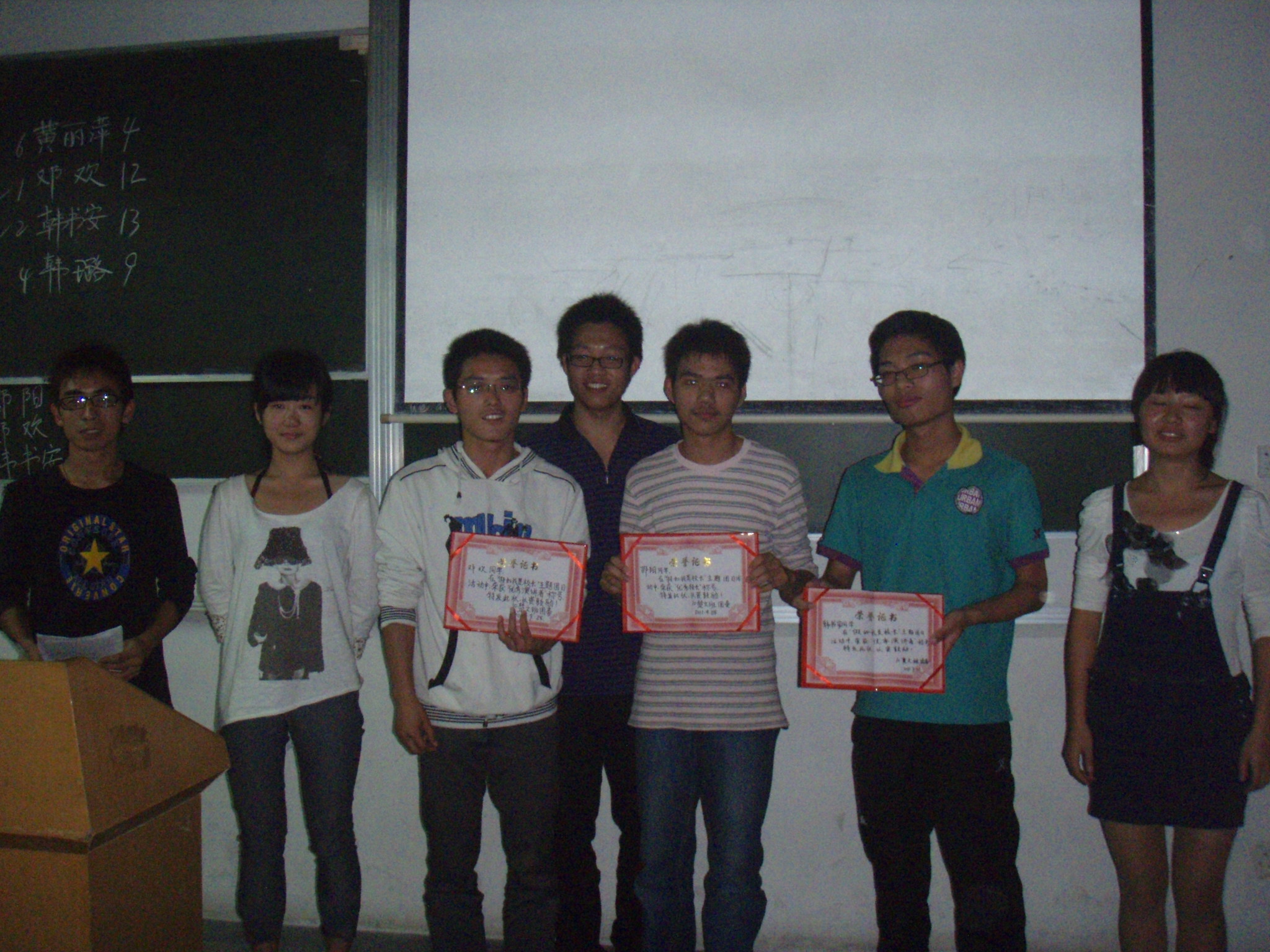 演讲结束以后,同学们进行了投票表决,邵阳、韩书安和邓欢三名同学位居前三。接下来是紧张而又具有挑战性的第二环节,三名获胜者站在讲台上同时接受同学们的不同提问。同学们的问题新颖而且深刻,三位参赛者的回答也是一针见血、全面细微。最终,邵阳同学以其幽默搞笑的语言、新颖奇特的想法脱颖而出。在最后一个环节里,班委模仿正式比赛的流程给获奖者颁发了荣誉证书并与其拍照留念,庆祝本次活动取得圆满成功。他们故作郑重的表情及动作,逗得大家哈哈大笑。
