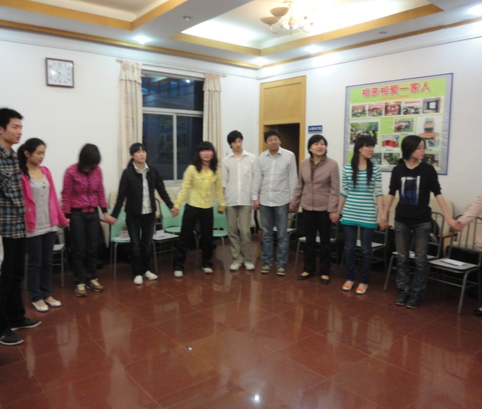 第二个环节是解结活动。同学们手拉着手围成一个大圈,记住自己的左右手分别是哪位同学,然后松开手随着音乐随意的走,等音乐一停找出刚才牵左右手的同学并重新握手,由此而留下了一个非常难解的结,而此活动的最终目的是在不放开左右手的前提下解开这个结。大家纷纷出谋划策,费了九牛二虎之力终于把结解开,虽然辛苦但考验了大家的协作能力,也让大家体会到团队的精神。